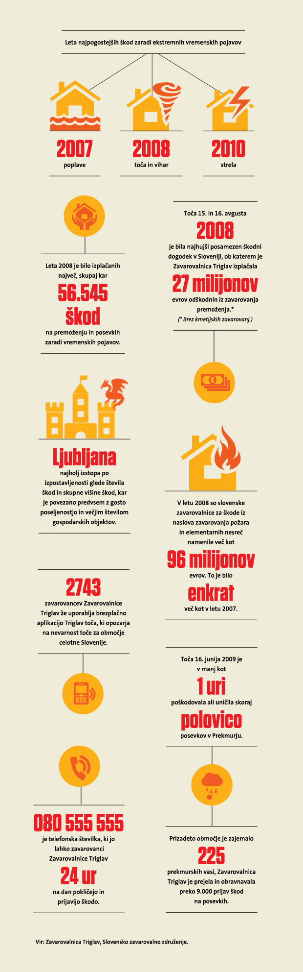 Strokovnjaki napovedujejo, da bodo izjemni vremenski pojavi postali del našega vsakdana. Tudi mi smo pobrskali po naših podatkih in skušali ugotoviti, kdaj, v kakšni obliki in kje v Sloveniji so ekstremne vremenske razmere v preteklih letih povzročile največ škode. Ker pravijo, da je po toči zvoniti prepozno, preverite, kako se lahko pred morebitno škodo ustrezno zavarujete.