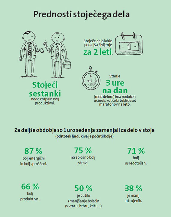 O pravilnem sedenju smo že veliko slišali. Vemo, da je pri nepravilnem sedenju hrbtenica dvakrat bolj obremenjena, kot če stojimo – pa tudi pravilno sedenje ne pomeni, da bo z vašo hrbtenico vse v redu. V zadnjem času vse bolj prodira nov trend pri oblikovanju ergonoskega delovnega mesta: delo stoje. Poglejmo si nekaj slabosti in prednosti obeh načinov.